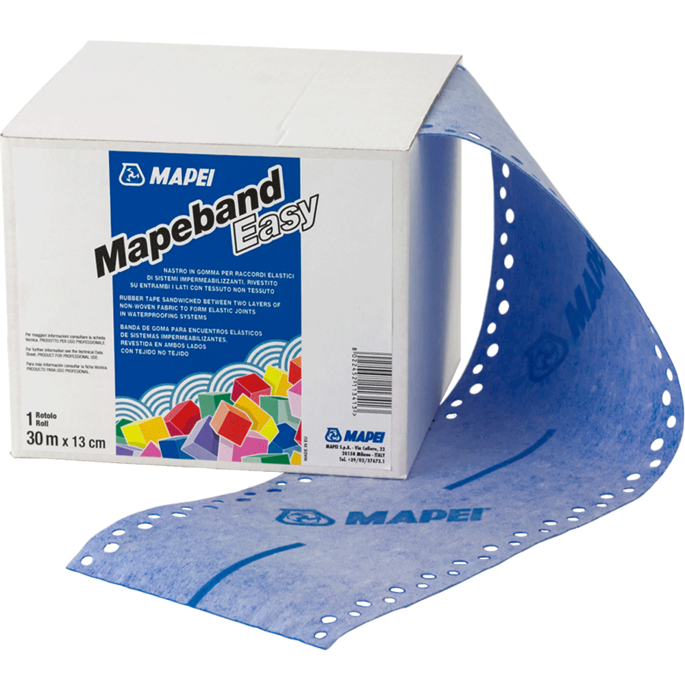 Rubber tape sandwiched between two layers of non-woven fabric to form elastic joints in waterproofing systems.